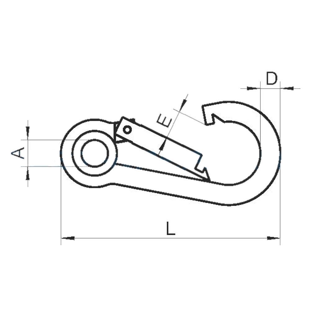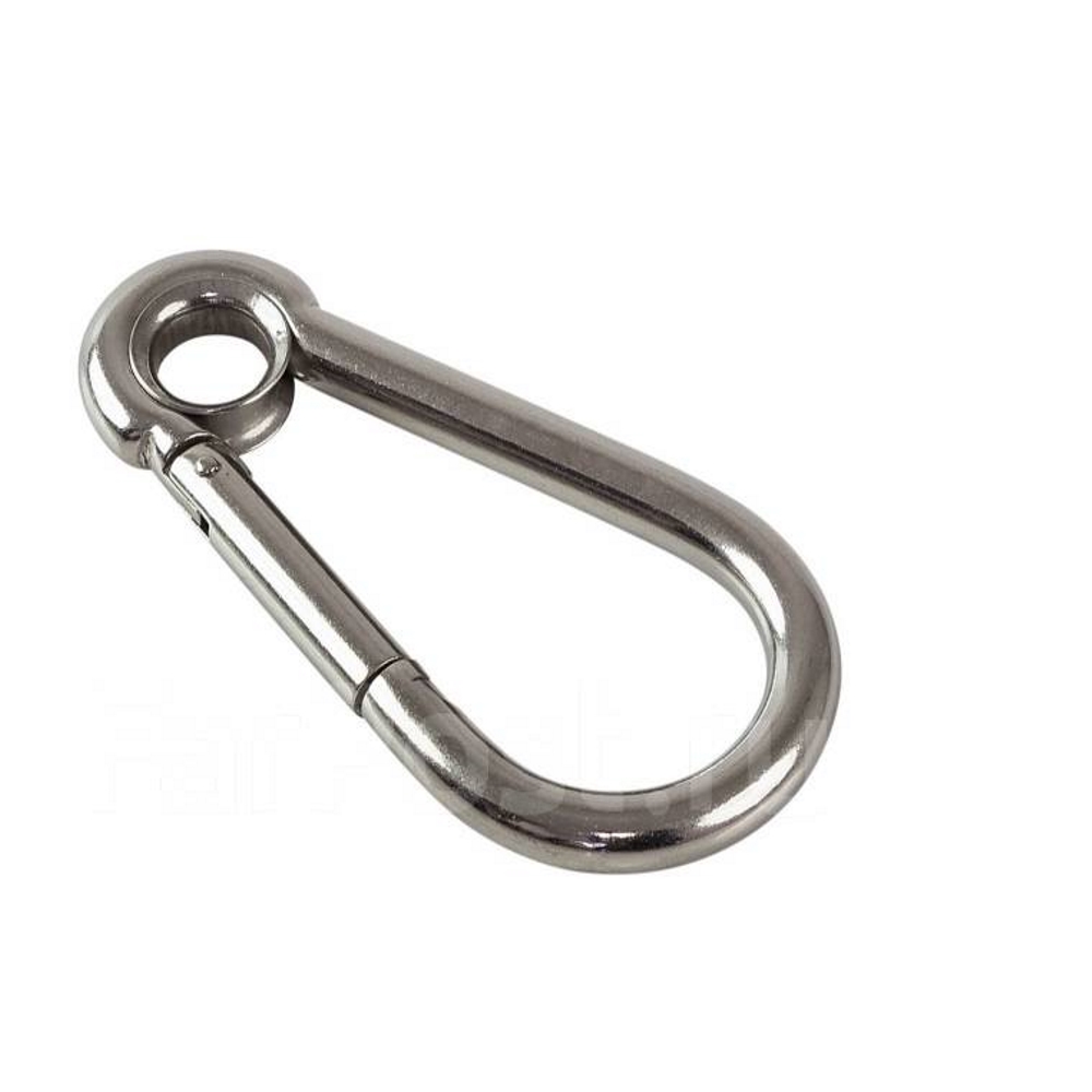 Пружинный (пожарный) карабин с кольцом Din 8250 – это элемент крепежа, изготовленный из нержавеющей стали А4. Имеет широкую область применения. Могут использоваться в промышленном альпинизме, погрузочно-разгрузочных работах, входят в комплект обязательного оборудования спасателей и пожарных. Преимуществом пружинных устройств является сочетание скорости соединения цепных или тросовых элементов и строп (за петлю) с одновременной высокой надежностью. Кольцо в карабине защищает трос от трения. Представленная модель изготовлена из нержавеющей стали марки А4 и может быть использована в экстремальных условиях эксплуатации. Широкий модельный ряд типоразмеров способствует применению пружинных карабинов для различных типов работ, не только в статичном соединении элементов, но и когда они пребывают в динамике: поводки для животных, фиксация ранцев и рюкзаков, страховочных тросов и т.п.