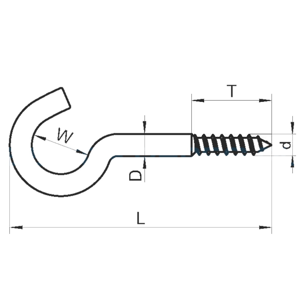 Шуруп-крюк – это стержень, в нижней части которого нарезана стандартная метрическая резьба, а верхняя изогнута в виде крюка. Конец с резьбой имеет острый наконечник. Шуруп изготовлен из высококачественной аустенитной нержавеющей стали А2. Этот материал плохо поддается коррозии: первые признаки ржавчины на нем появляются приблизительно через 50 лет использования в неблагоприятных условиях. Столь же успешно сталь противостоит агрессивным средам: кислотам и щелочам. Этот крепеж очень прочен и долговечен.